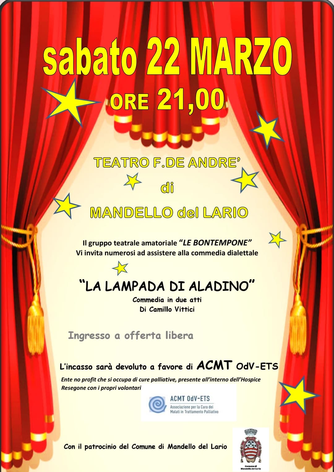Il gruppo teatrale amatoriale "Le Bontempone", con il Patrocinio del Comune di Mandello del Lario, vi invita numerosi ad assistere alla commedia dialettale "LA LAMPADA DI ALADINO", sabato 22 marzo alle ore 21.00 presso il Teatro De André.