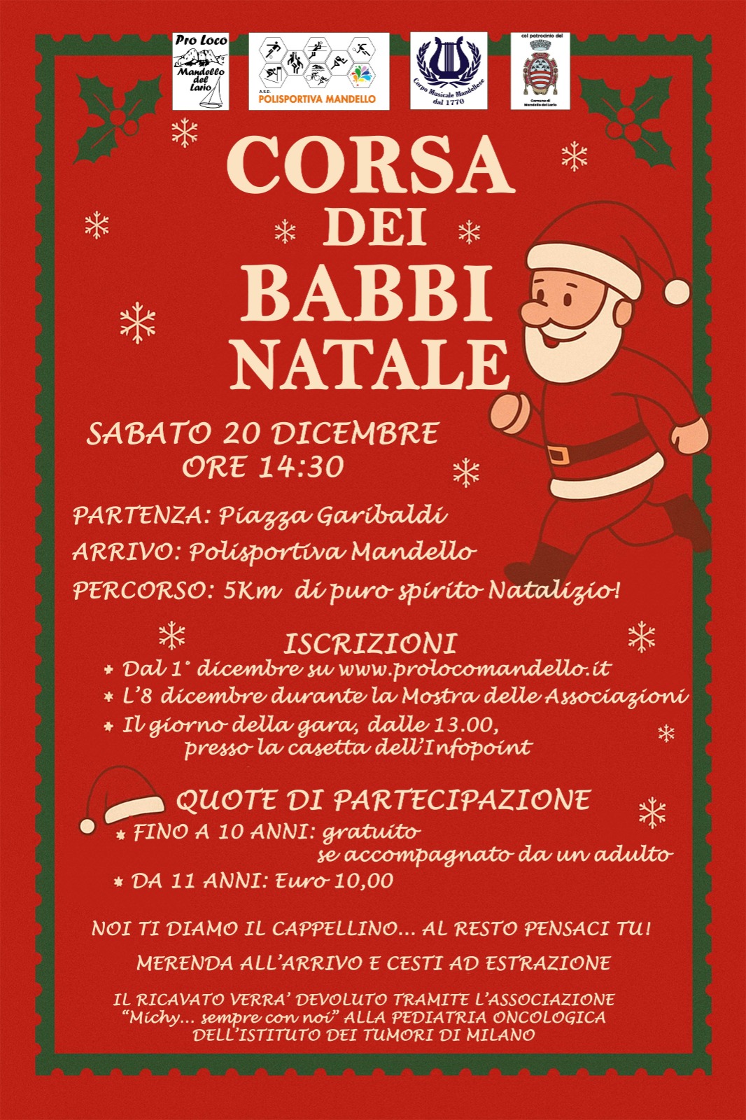 Percorso di 5 km di puro spirito natalizio. Partenza ore 14.30 da Piazza Garibaldi - arrivo presso la Polisportiva Mandello