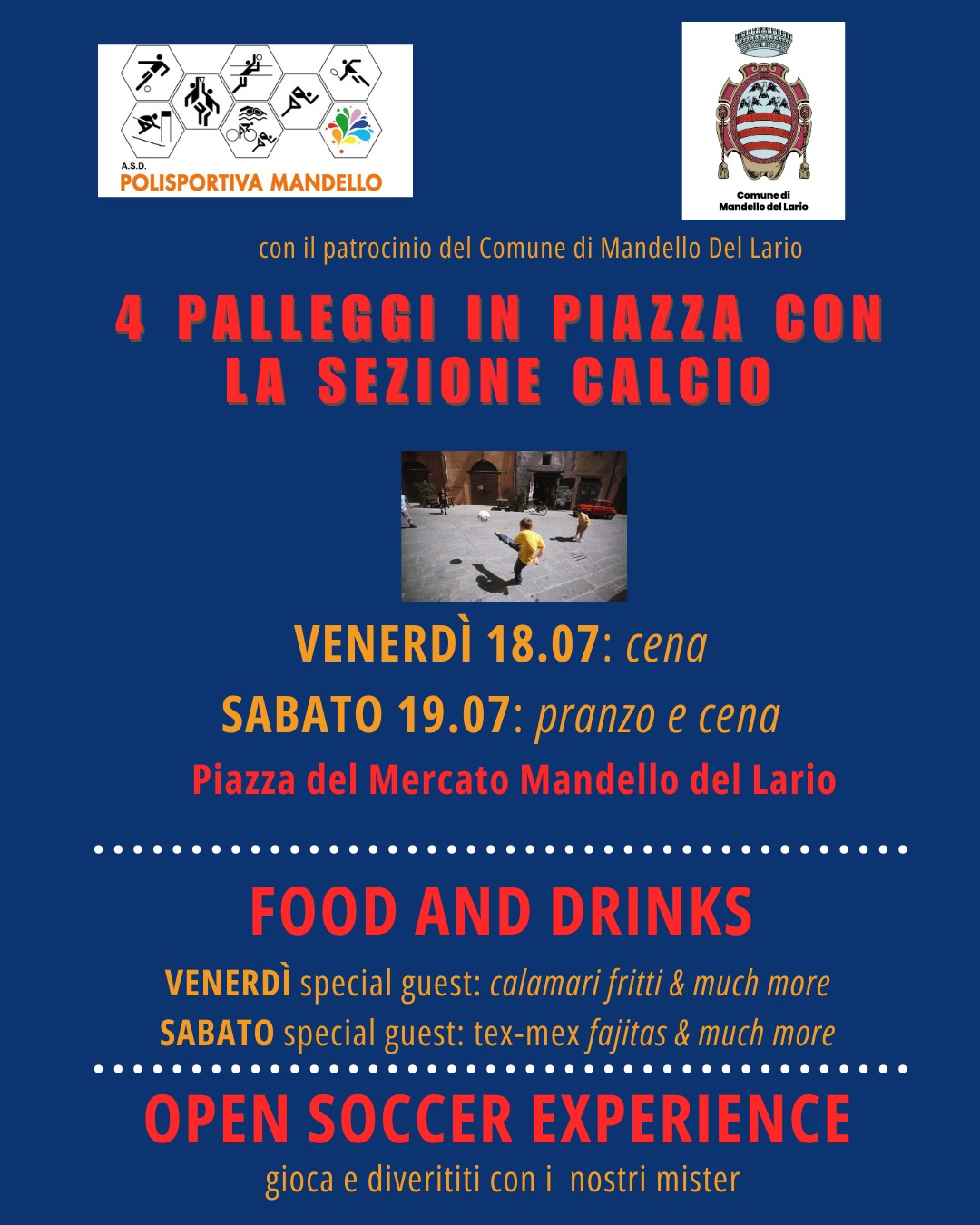 La sezione calcio della Polisportiva Mandello, con il Patrocinio del Comune di Mandello del Lario, organizza una due giorni in piazza Mercato, venerdì 18 e sabato 19, all’insegna del buon cibo, del divertimento e dello sport aperto a tutti.
