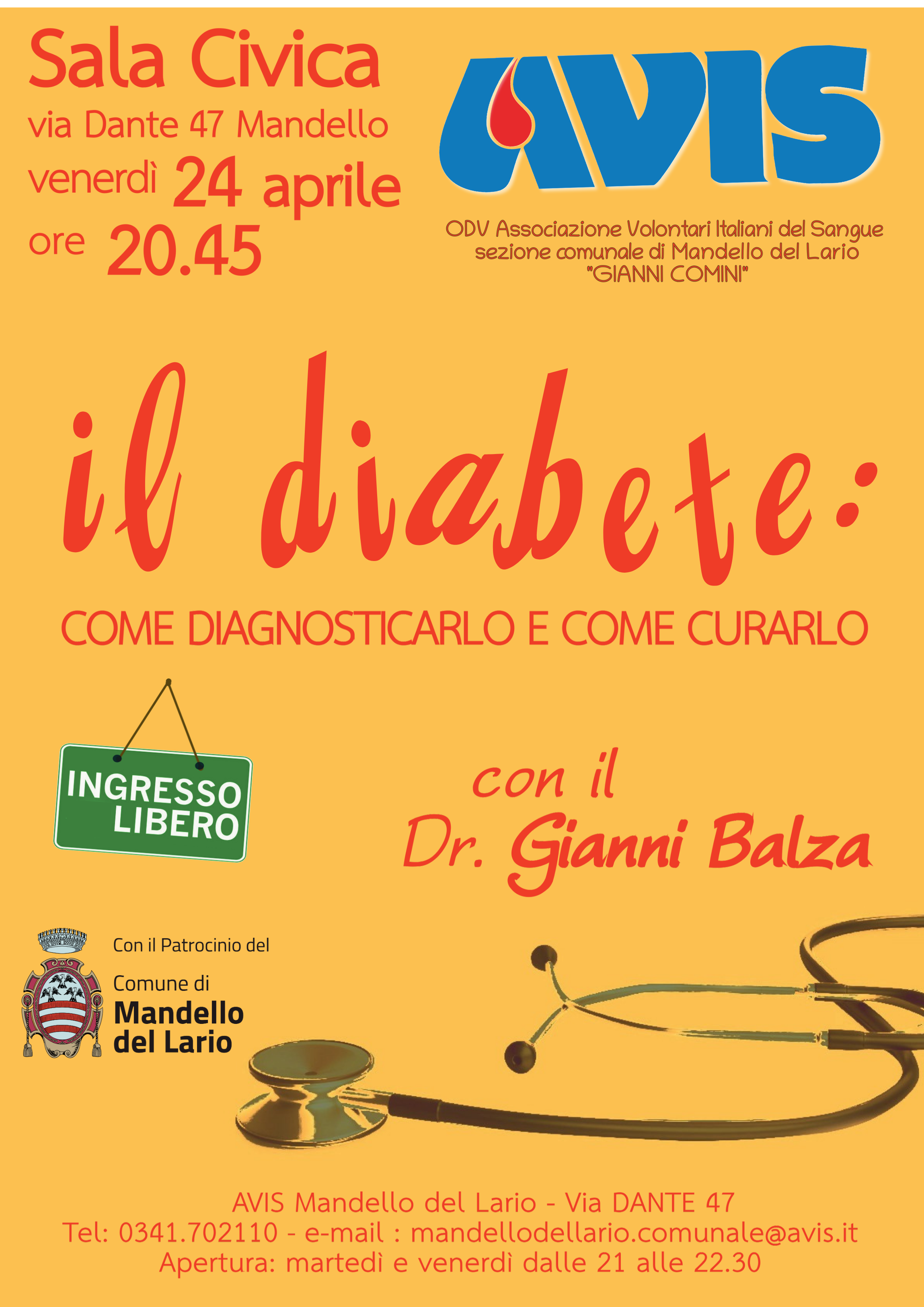 Avis Associazione Volontari Italiani del Sangue ODV Sezione Comunale di Mandello del Lario "Gianni Comini", con il Patrocinio del Comune di Mandello del Lario, organizzano la serata informativa con il Dr. Gianni Balza "Il diabete: come diagnosticarlo e come curarlo"