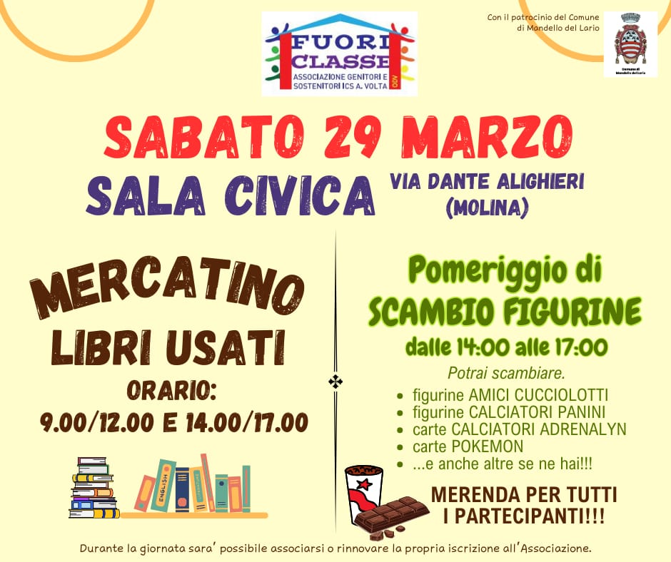 L'Associazione Fuoriclasse genitori e sostenitori ICS A. Volta, con il Patrocinio del Comune di Mandello del Lario, organizza sabato 29 marzo presso la Sala Civica di via Dante Alighieri (Molina):