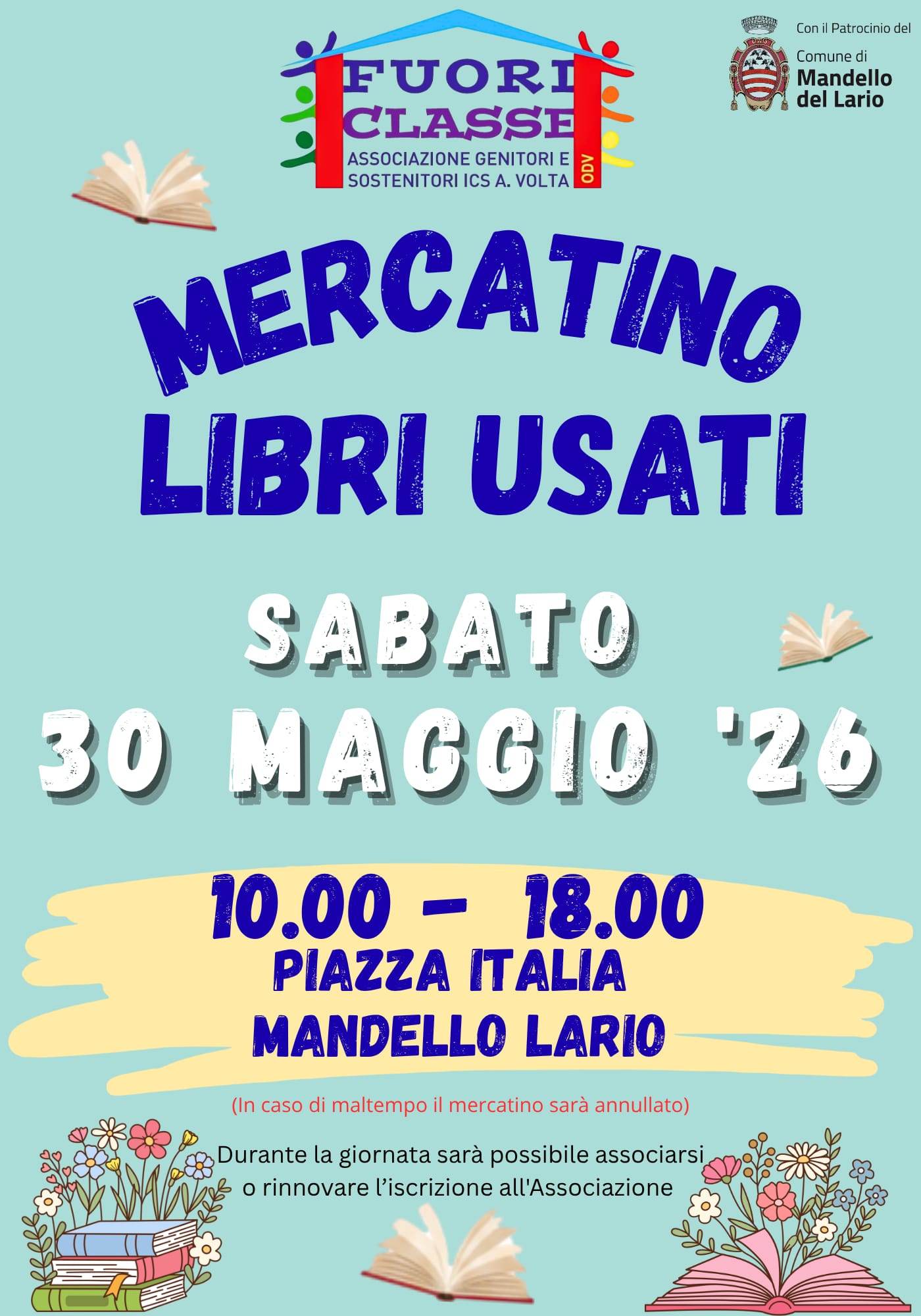 L'Associazione genitori e sostenitori ICS A. Volta Fuoriclasse, con il patrocinio del Comune di Mandello del Lario, organizza il Mercatino dei libri usati sabato 30 maggio presso piazza Italia.