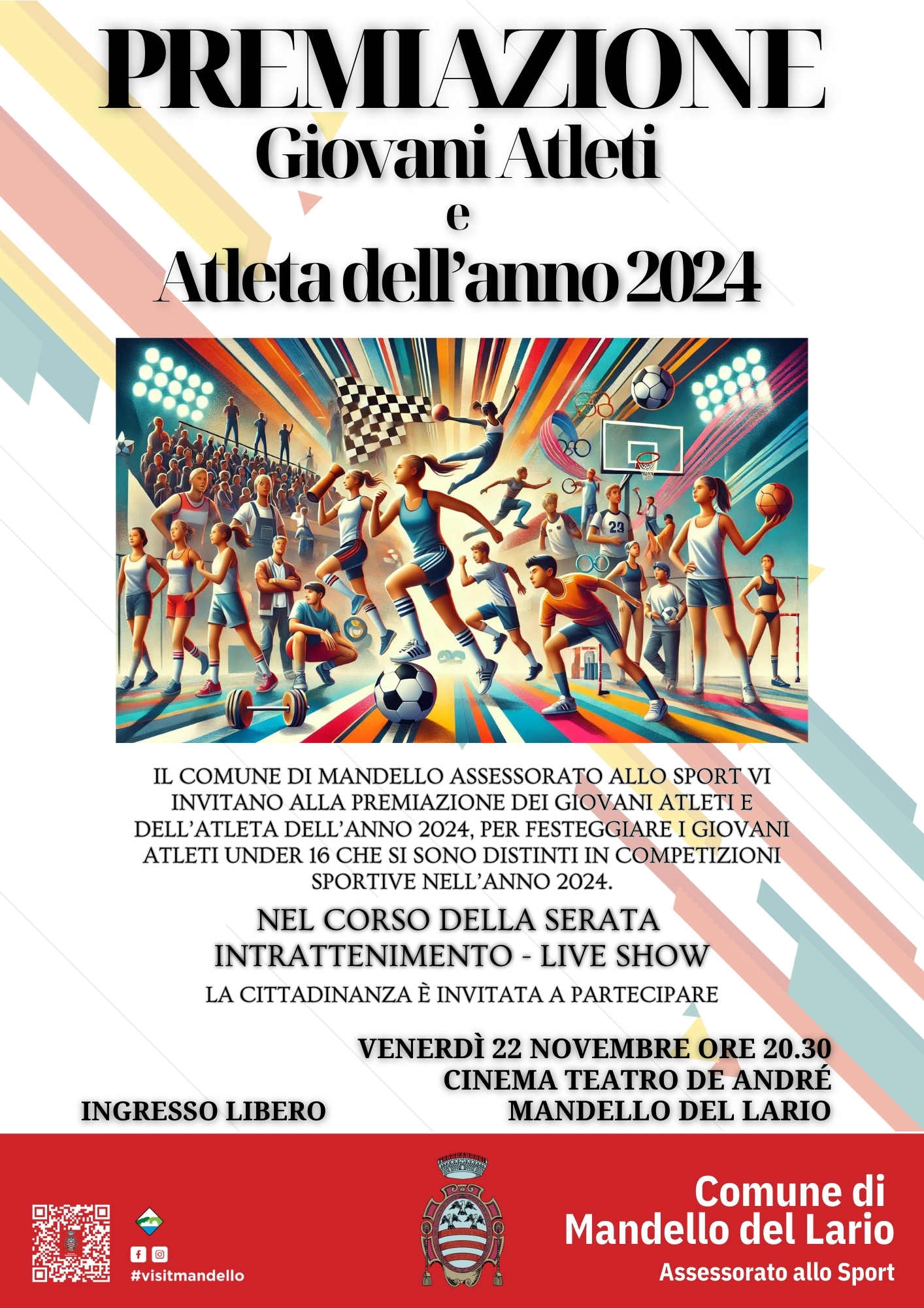 Il Comune di Mandello del Lario è lieto di invitare la cittadinanza alla Cerimonia di Premiazione dei Giovani Atleti e dell'Atleta dell'Anno 2024, che si terrà venerdì 22 novembre alle ore 20.30 presso il Cinema Teatro Fabrizio De André.