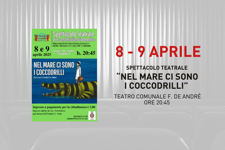 L'Associazione Fuoriclasse Associazione genitori e sostenitori ICS A. Volta ODV vi invita ad assistere allo spettacolo teatrale "nel mare ci sono i coccodrilli" di e con Christian Di Domenico.