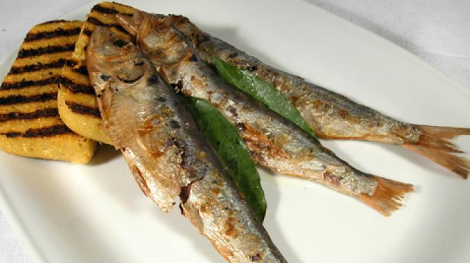 Scottare su una piastra i pesci. Immergerli brevemente in un emulsione composta da due parti di olio e una parte di aceto, con l’aggiunta di un paio di foglie di alloro. Servirli sopra una fetta di polenta abbrustolita.
