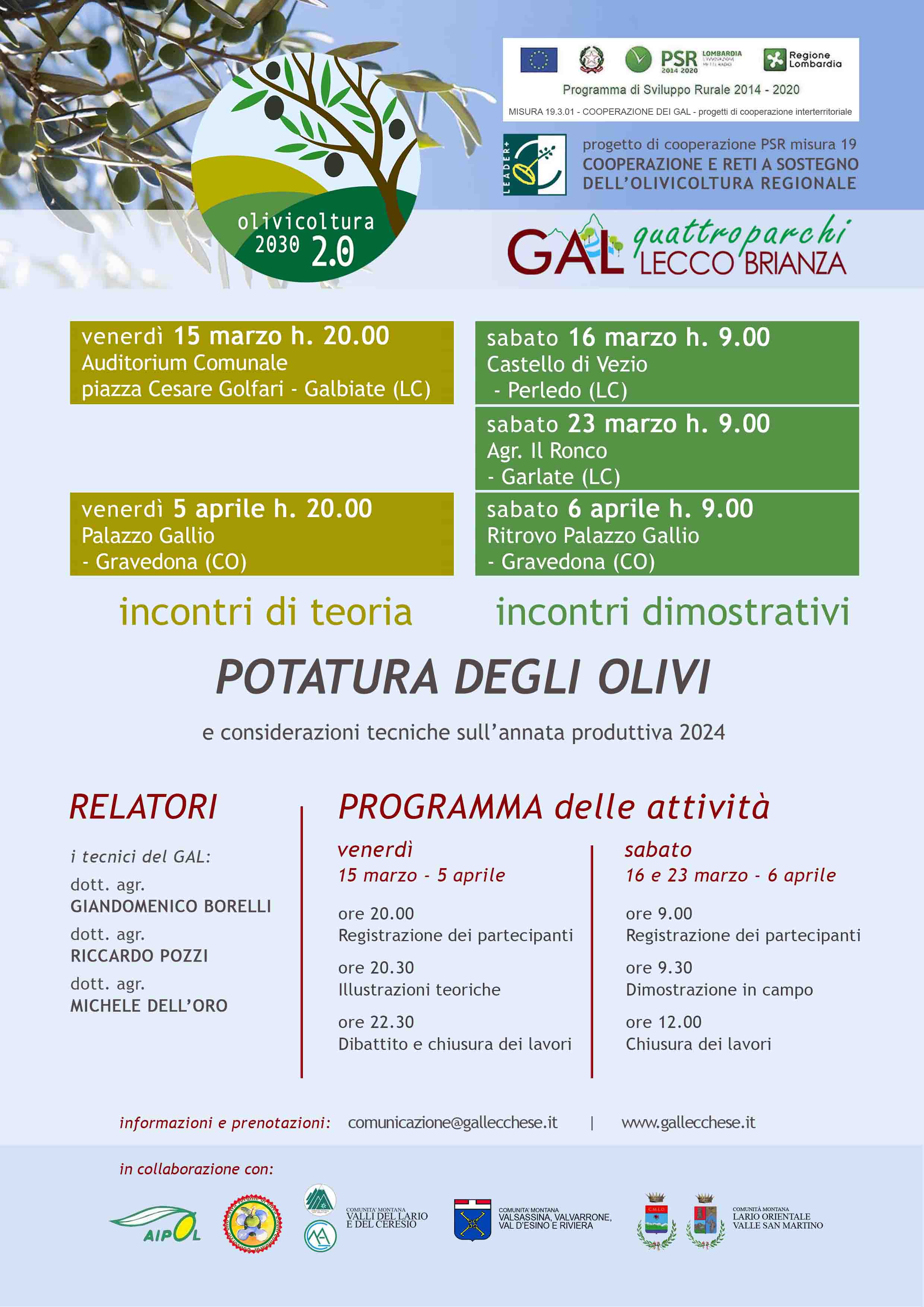 GAL Quattro Parchi Lecco-Brianza, in collaborazione con le Comunità Montane, AIPOL e Consorzio olio extra-vergine di oliva Laghi Lombardi, ha organizzato una serie di incontri teorico-pratici di potatura degli olivi e considerazioni tecniche sull'annata produttiva 2024, all'interno del progetto di cooperazione PSR misura 19 - Cooperazione e reti a sostegno dell'olivicoltura regionale.