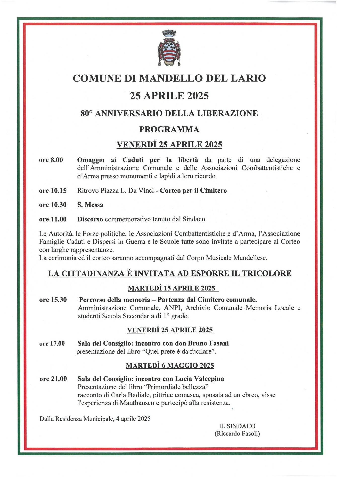 Le Autorità, le Forze politiche, le Associazioni Combattentistiche e d'Arma, l'Associazione Famiglie Caduti e Dispersi in Guerra e le Scuole tutte sono invitate a partecipare al Corteo con larghe rappresentanze.