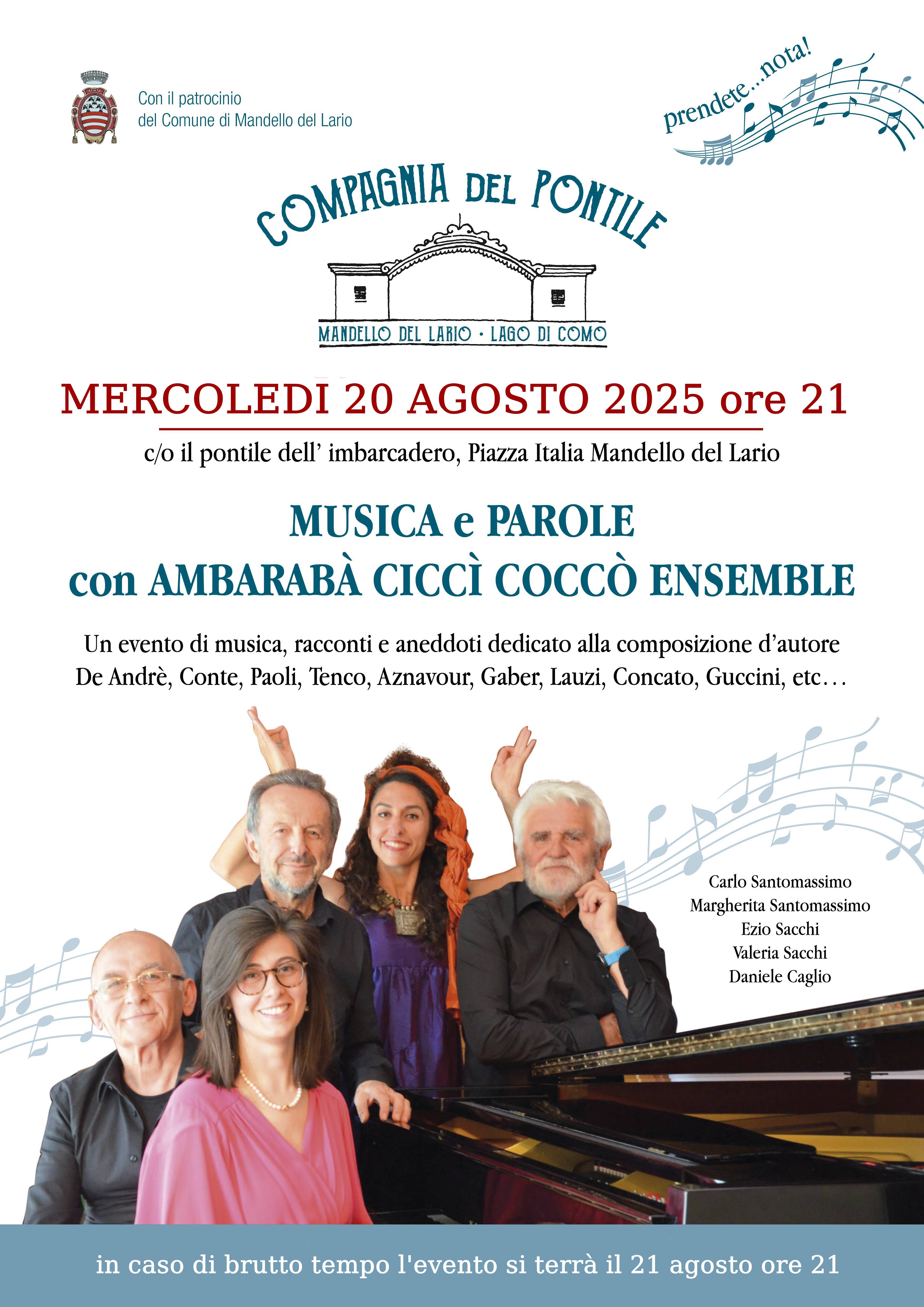 La Compagnia del Pontile, con il Patrocinio del Comune di Mandello del Lario, vi invita al recital Musica e Parole con gli Ambaraba Ciccì Coccò Ensamble, mercoledì 20 agosto alle ore 21:00 in piazza Italia, in recupero della serata prevista lo scorso 23 luglio.