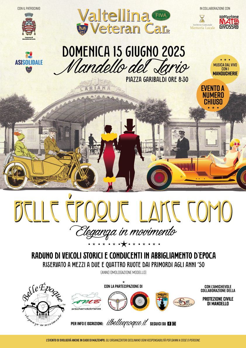 Valtellina Veteran Car con il Patrocinio del Comune di Mandello del Lario, organizza domenica 15 giugno 2025 in Piazza Garibaldi dalle ore 08.30 la terza edizione di "Belle Epoque Lake Como - Eleganza in movimento" raduno di veicoli storici a due, tre o quattro ruote dai primordi agli anni 50', con conducenti in abbigliamento d'epoca.