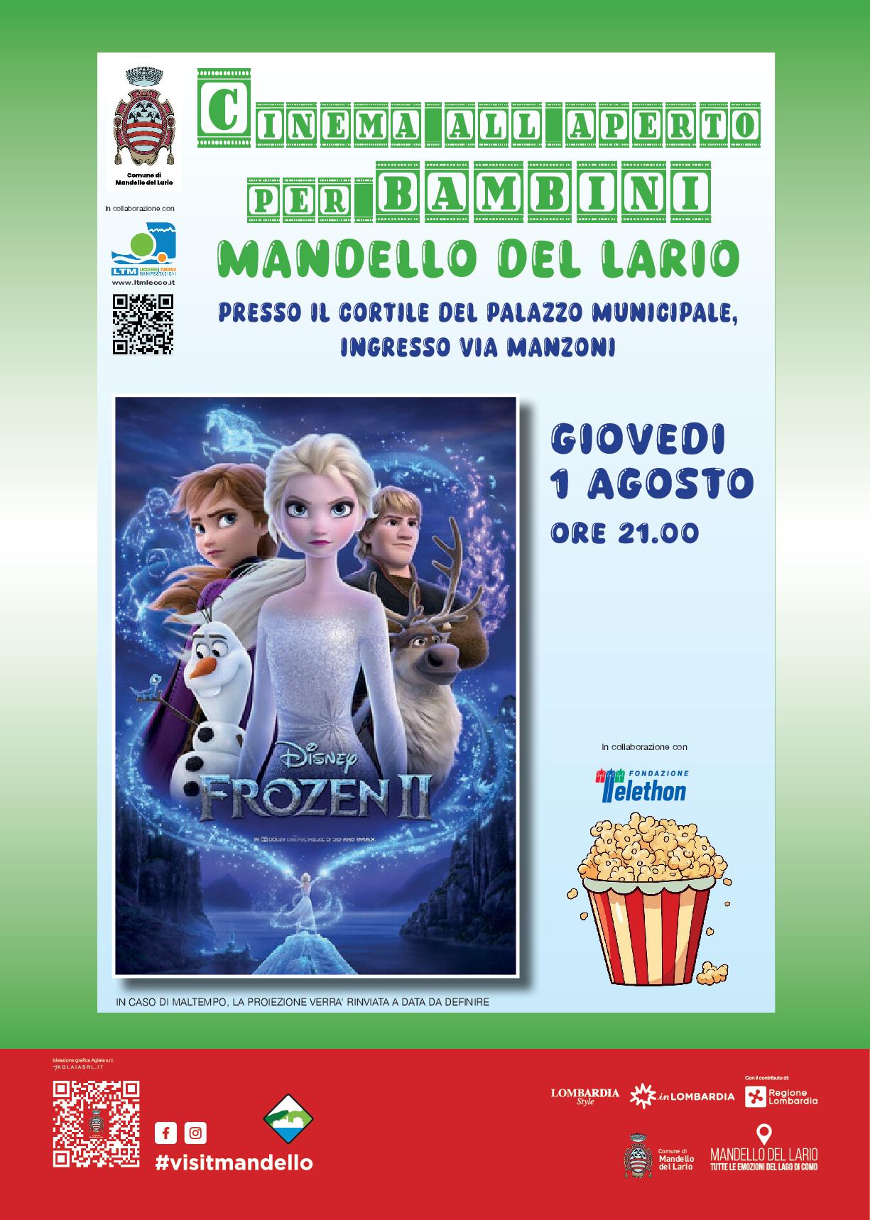Giovedì 01 agosto, ti aspettiamo nella Piazzetta retro Comune, alle ore 21:00, con la proiezione di Frozen II.