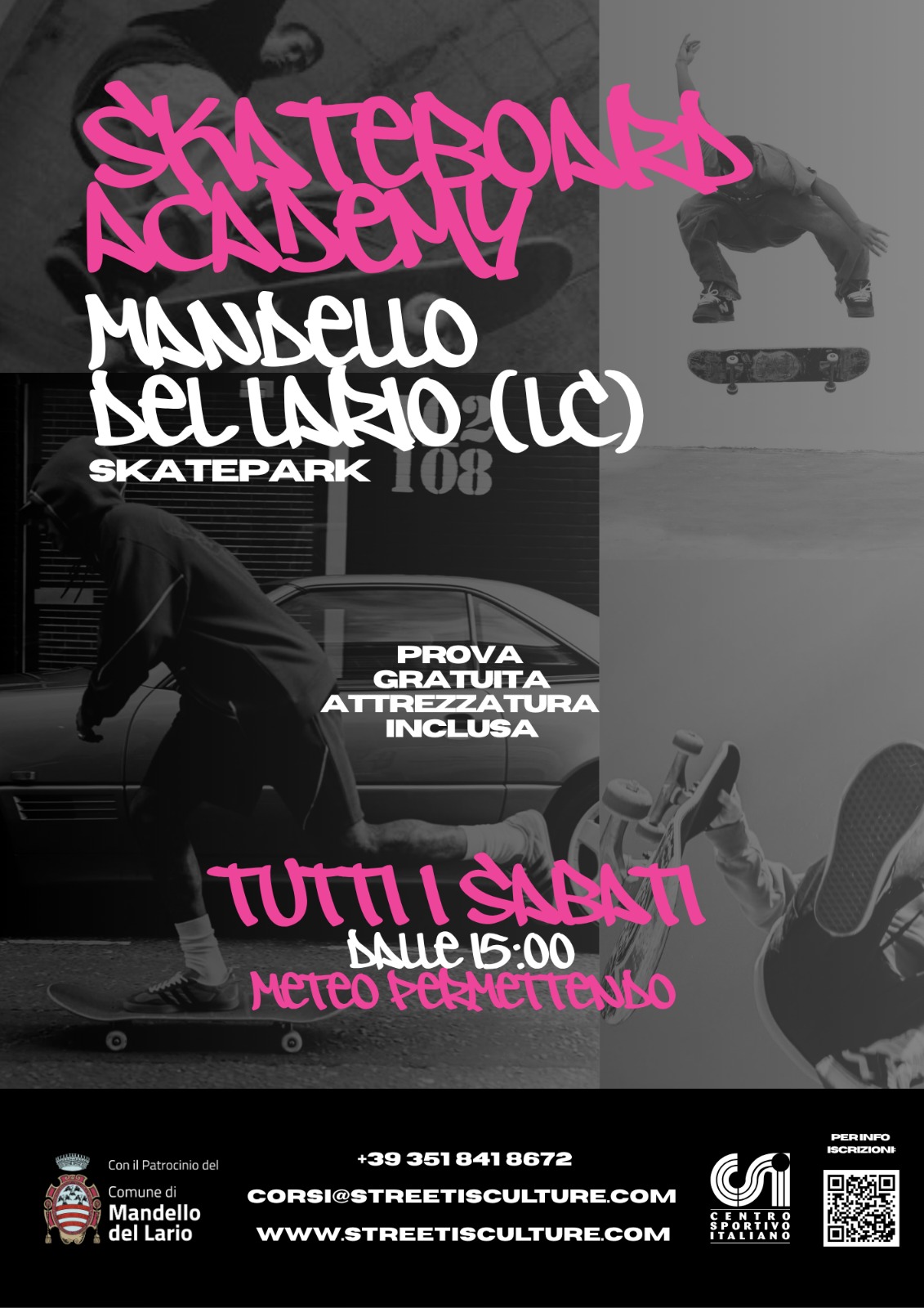 L'Associazione Street is Culture, con il patrocinio del Comune di Mandello del Lario, organizza ogni sabato dall’11 aprile al 27 giugno 2026 presso lo Skatepark, un corso dedicato a bambini e ragazzi.