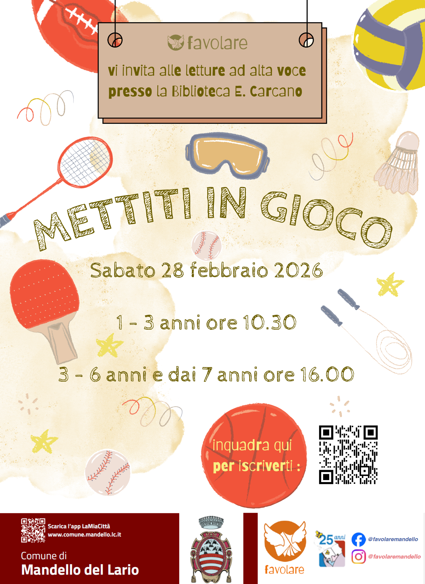 Sabato 28 Febbraio 2026 il Gruppo Favolare organizza la lettura ad alta voce "Mettiti in gioco" in Biblioteca: