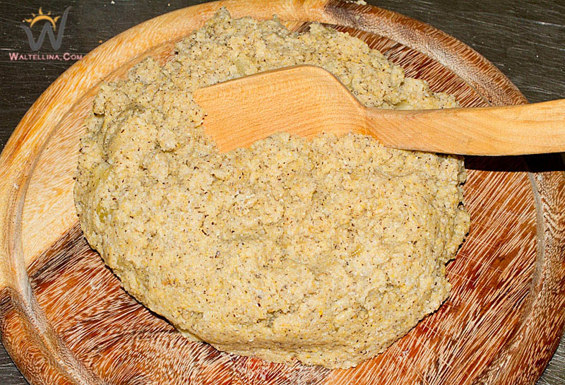 Prima che l’acqua entri in ebollizione, salare e successivamente versare la farina a pioggia; mescolare con la frusta durante lo sversamento della farina affinché non si formino grumi. Continuare la cottura, sempre mescolando, per 45 minuti.